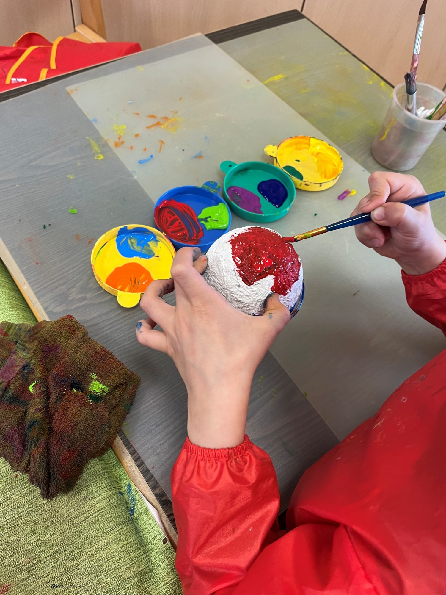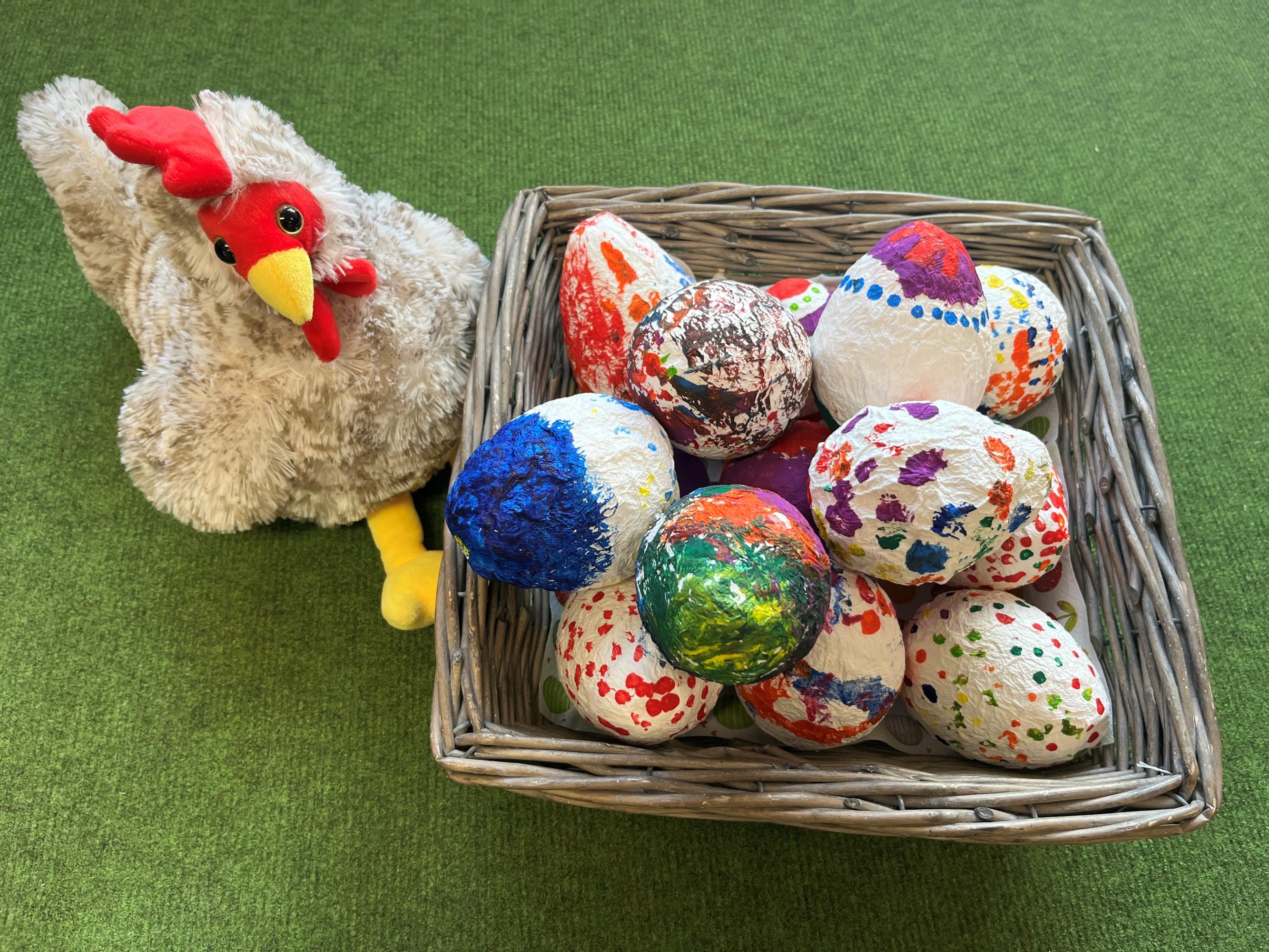 In den letzten Tagen waren die Kinder fleißig am Werk. Es entstehen bunte Schütteleier, die wir für unsere Musikprojekte nutzen können, und natürlich sind auch die Ostertüten und viele kreative Ostereier in Planung. Unsere Plüsch-Henne Berta freut sich riesig über all die Aktivität und die vielen Eier. Ausbrüten würde sie schon gerne eines! Ob das etwas wird?