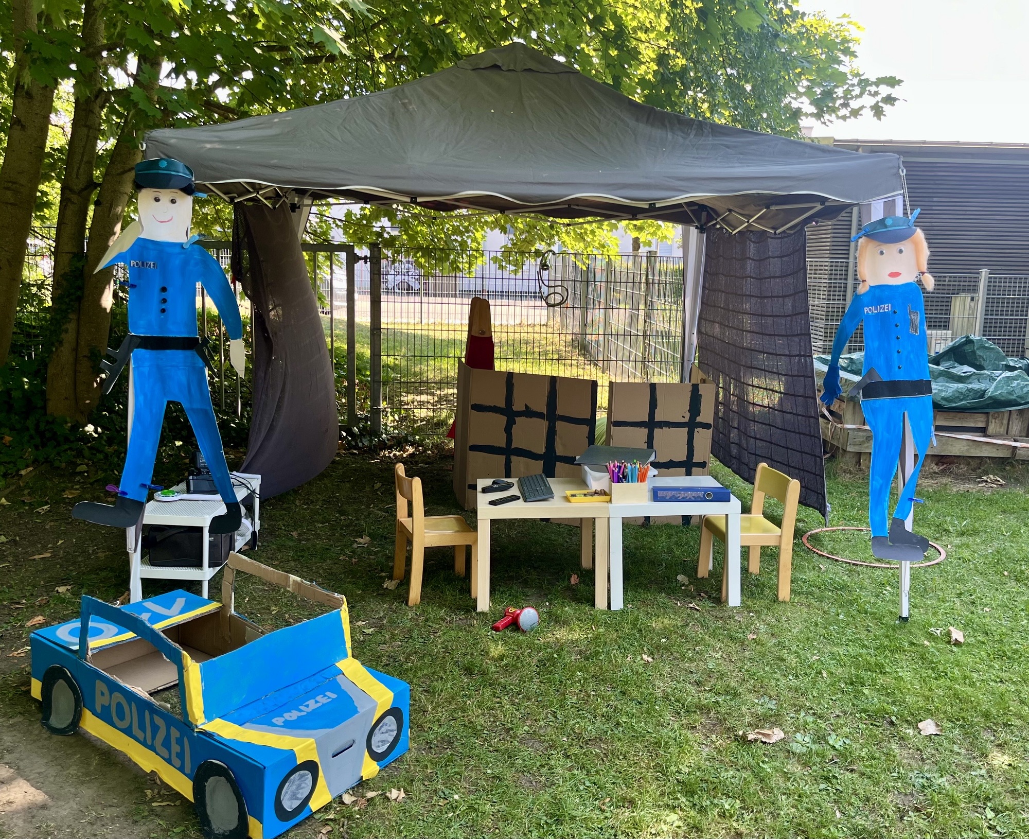 Besonders viel Freude hatten die Kinder beim Basteln – mit viel Fantasie und Geschick entstanden aus Pappe Polizeiautos und Gefängnisse. Ein echtes Highlight war der Besuch der Polizei, die mit einem Einsatzfahrzeug vor Ort war und den Kindern einen authentischen Einblick in ihre Arbeit ermöglichte.